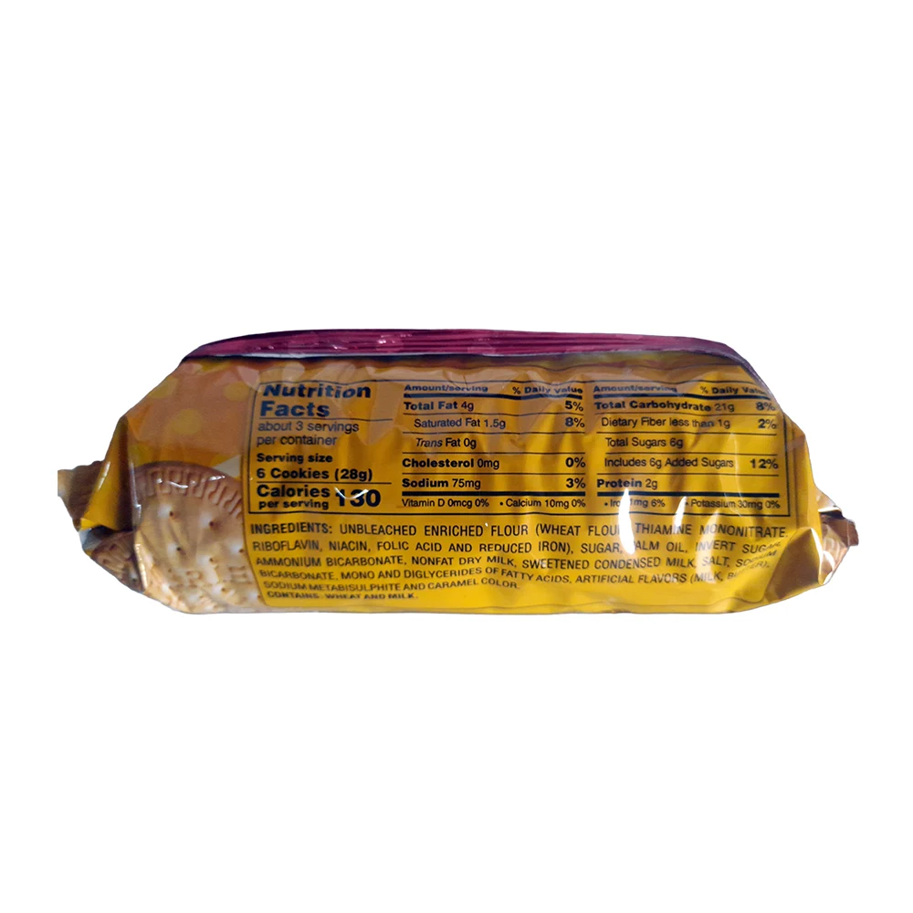 Las galletas están elaboradas con harina enriquecida sin blanquear, azúcar, aceite de palma, leche condensada, leche en polvo, sal y saborizantes artificiales como vainilla y leche. También contienen agentes leudantes y colorantes como FD&C amarillo 5 y caramelo. Es importante tener en cuenta que contienen trigo y leche, y se producen en instalaciones que procesan soya y nueces de árbol, por lo que no son aptas para personas con alergias a estos ingredientes.