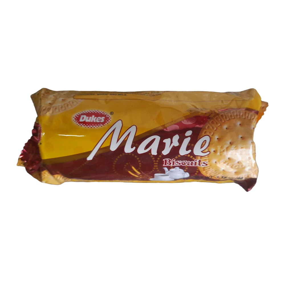 Presentadas en un empaque llamativo de tonos amarillo y burdeos, destacan por su diseño elegante que incluye imágenes de las galletas junto a una tetera y taza blanca, evocando el tradicional ritual del té. La marca Dukes, reconocida por su calidad, se muestra en un óvalo rojo sobre el fondo vibrante, mientras que el nombre “Marie” aparece en una tipografía cursiva blanca que resalta la sofisticación del producto.