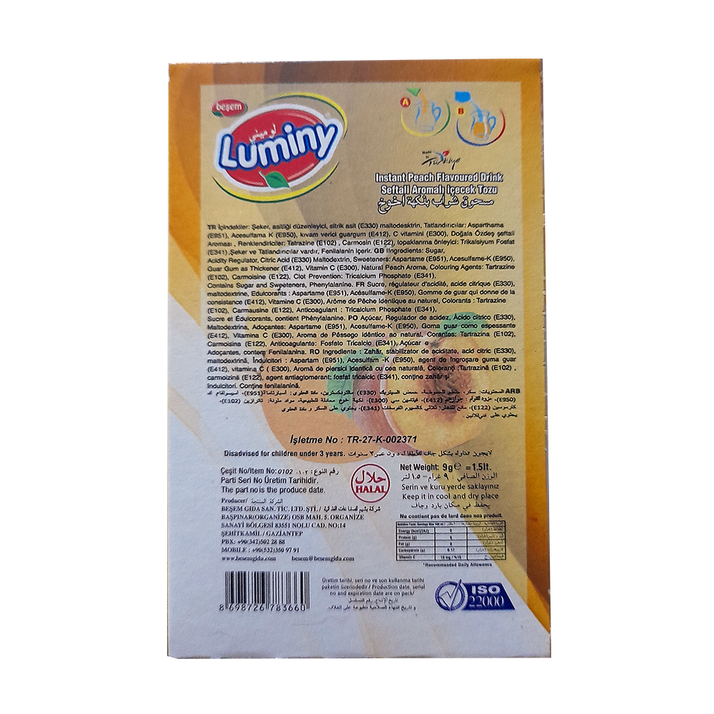 Descubre el refresco en polvo Luminy con sabor a Melocotón, una opción refrescante y deliciosa que transforma tu agua en una bebida irresistible. Cada paquete de 9 gramos está diseñado para rendir hasta 1.5 litros, lo que lo convierte en la elección perfecta para compartir en reuniones o disfrutar en cualquier momento del día. Su sabor afrutado y natural te brindará una experiencia única, ideal para saciar tu sed de manera práctica y económica.