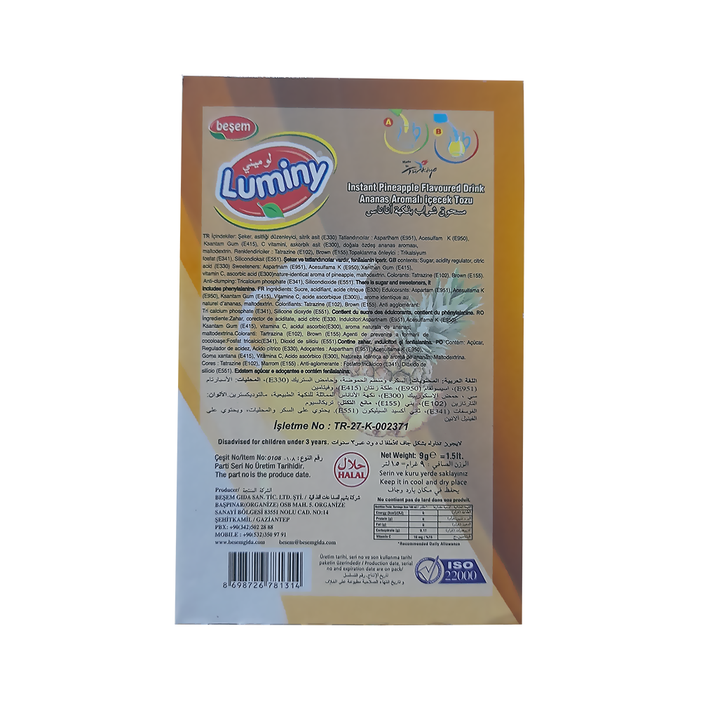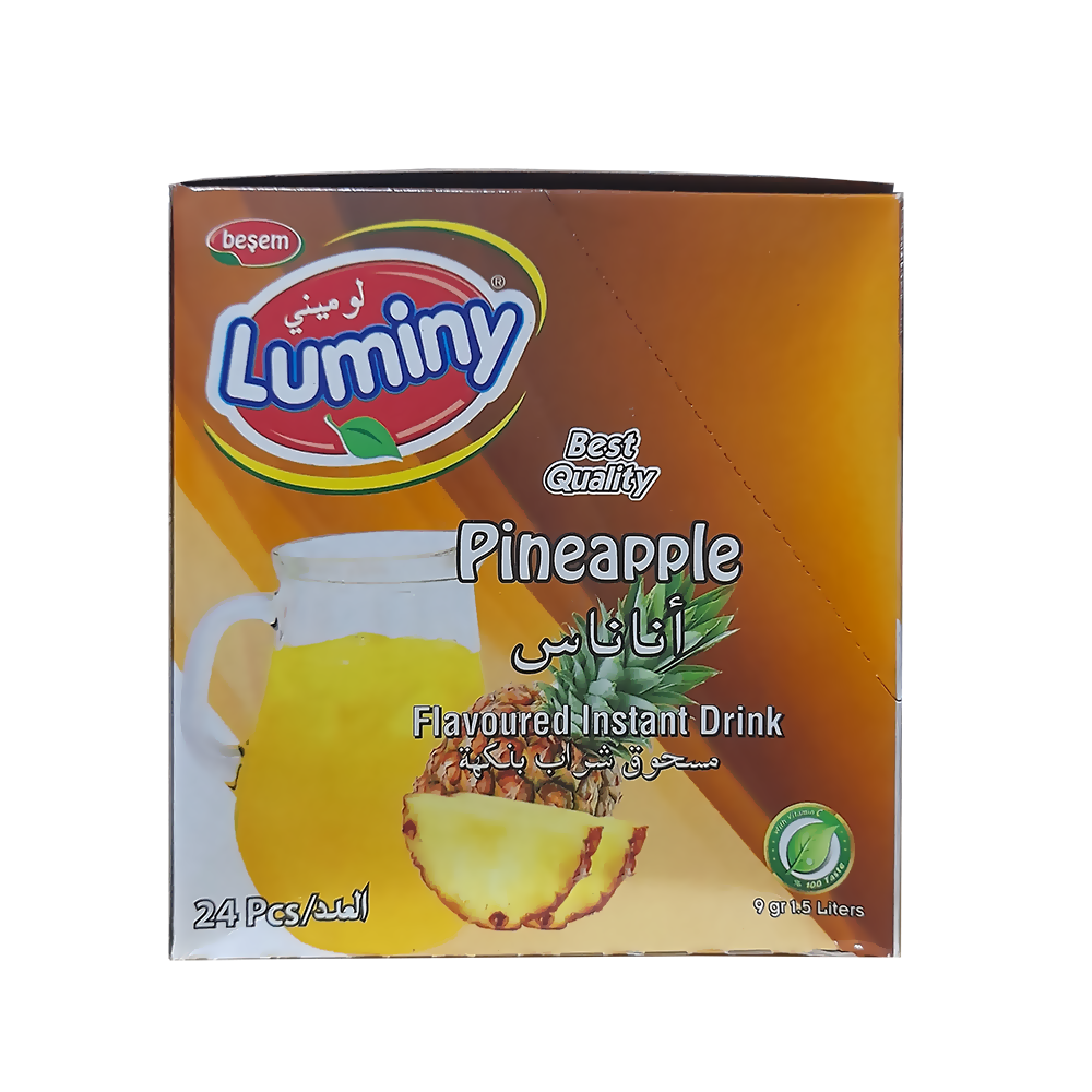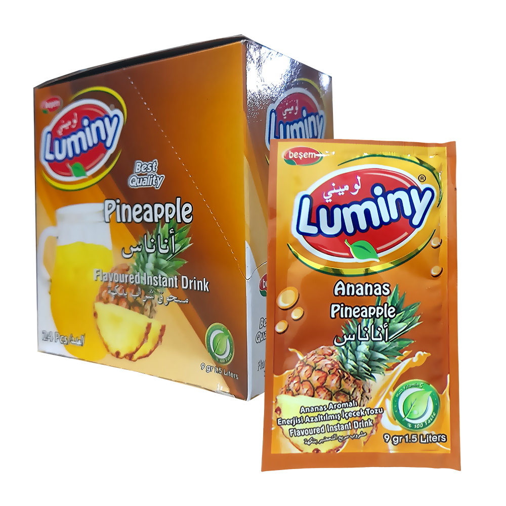 Disfruta del refrescante sabor de la piña con el refresco en polvo Luminy. Cada paquete de 9g rinde hasta 1,5 litros, ideal para compartir en cualquier ocasión. Su fácil preparación te permitirá disfrutar de una bebida deliciosa y revitalizante en minutos. Perfecto para fiestas, picnics o simplemente para saciar tu sed en casa. ¡Haz de cada sorbo una experiencia tropical!