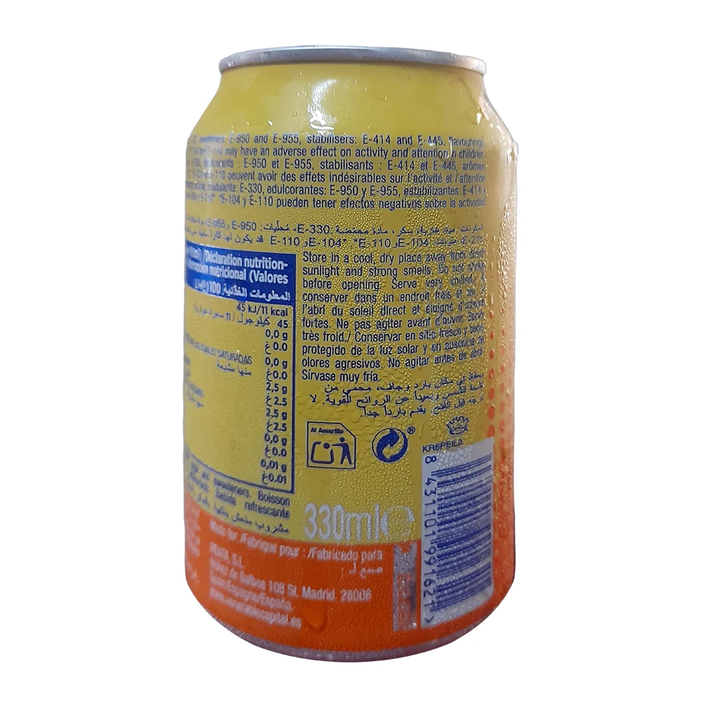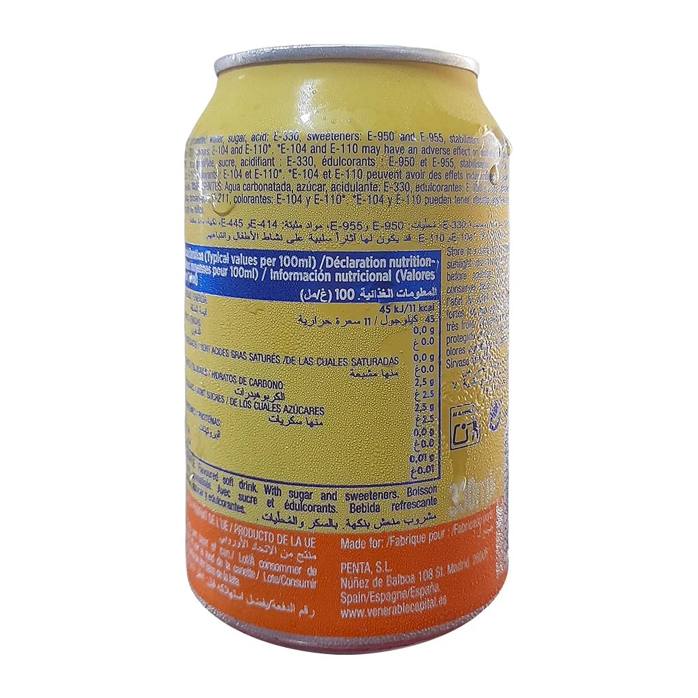 Elaborado con agua carbonatada, azúcar y edulcorantes, este refresco combina el dulzor natural con un toque equilibrado de acidez gracias al ácido cítrico. Contiene colorantes y aromatizantes que realzan su atractivo visual y su perfil gustativo, ofreciendo una experiencia sensorial completa. Entre sus ingredientes destacan los estabilizantes y conservadores que garantizan calidad y frescura en cada lata, además de un contenido energético moderado que lo hace apto para disfrutar en cualquier momento del día.