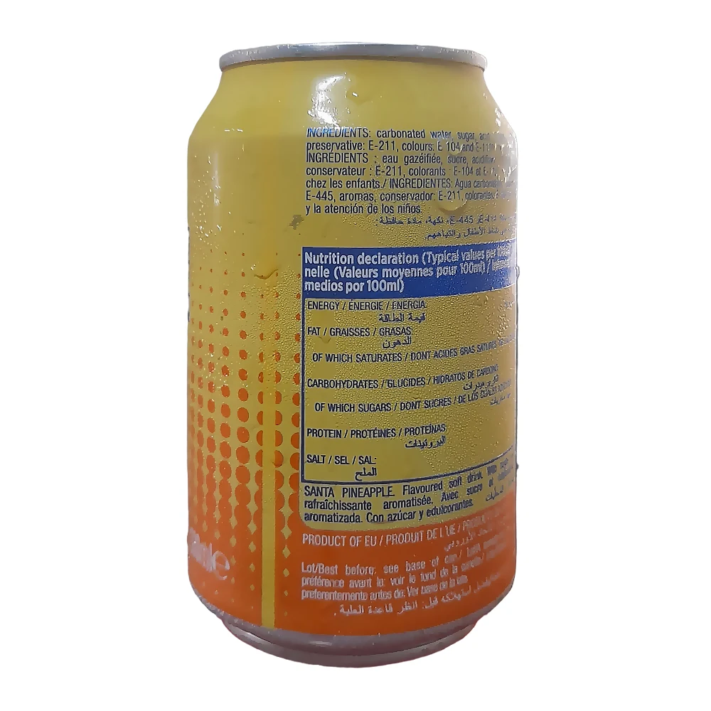 El Refresco Gaseado Santa Piña (330 ml) es una bebida refrescante que captura la esencia tropical de la piña en cada sorbo. Presentado en una lata vibrante de tonos amarillos y naranjas con detalles gráficos de la fruta, transmite frescura y vitalidad desde su diseño. Su carácter chispeante y afrutado lo convierte en una opción ideal para quienes buscan un sabor dulce y exótico acompañado de burbujas ligeras que estimulan el paladar.