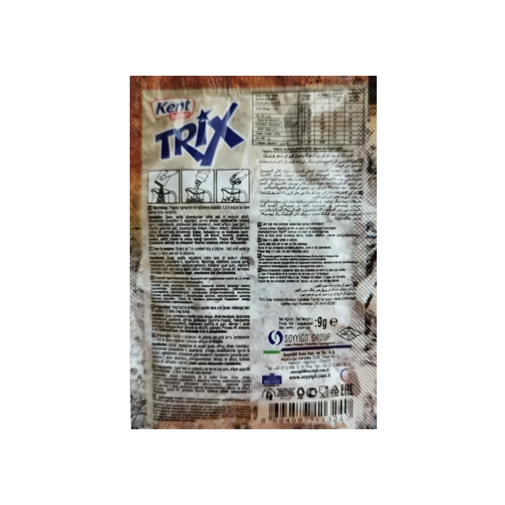 El refresco instantáneo Kent Boringer Trix sabor Melocotón, elaborado por la reconocida compañía turca Soyyiğit Group, es una opción práctica y deliciosa para quienes disfrutan de bebidas refrescantes con un toque frutal. Cada sobre contiene 9 gramos de producto, cuidadosamente formulado para rendir hasta 1.5 litros de refresco, ofreciendo un sabor suave y natural que evoca la dulzura característica del melocotón.